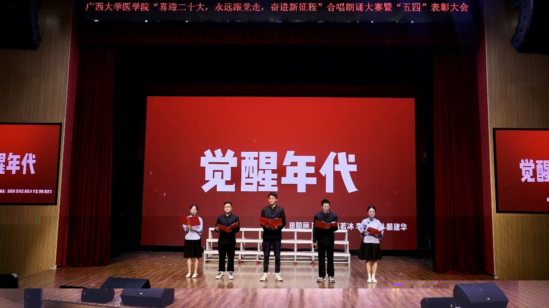 5月22日晚,澳门太阳集团9728网站在大學活動中心的小禮堂舉辦“喜迎二十大,永遠跟黨走,奮進新征程”合唱朗誦大賽暨“五四”表彰大會。院黨委副書記李莉、團委書記羅波和輔導員鄭豔青出席大賽并擔任評委。鑒于疫情防控要求,該活動采取線下觀衆代表+雲錄制的方式舉行。現場的二十餘名師生觀衆,與演員們一起回望五四峥嵘歲月,歌頌偉大的中國共産黨,感恩祖國,奮進新時代。