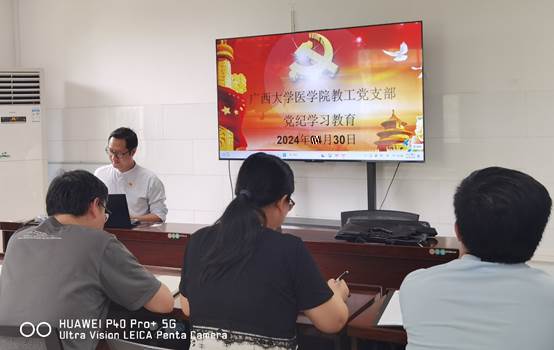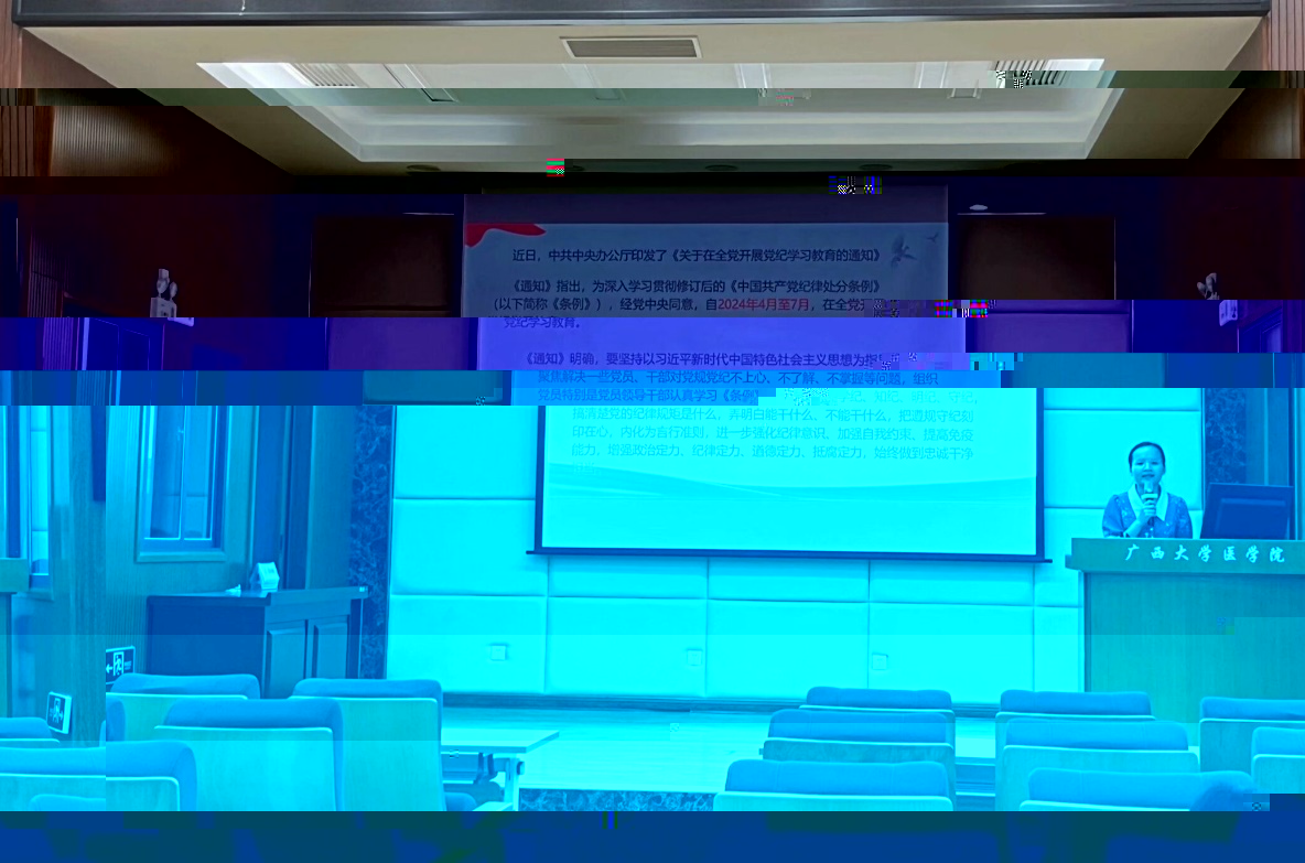 4月30日,澳门太阳集团9728网站行政黨支部書記廖碧蓮同志為支部黨員上題為《黨紀學習教育》的專題黨課,并觀看警示教育典型案例。幫助教師黨員深刻理解《中國共産黨紀律處分條例》條款要求,真正做到學紀、知紀、明紀、守紀。進一步強化教師黨員的紀律意識、增強政治定力、紀律定力,始終做到忠誠幹淨擔當。