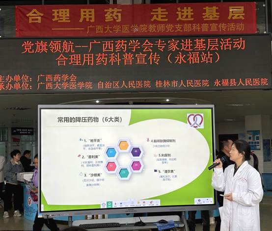 為全面貫徹黨的二十屆三中全會精神,增強人民群衆安全用藥意識,普及合理用藥的重要性,根據自治區科協等21部門關于印發《2024年全國科普日廣西活動暨八桂科普大行動方案的通知》的要求,學院教師黨支部參加近期在桂林永福縣人民醫院舉辦“合理用藥科普宣傳及抗菌藥物的合理使用”藥學科普宣傳日暨專家義診活動。該活動由廣西藥學會主辦,澳门太阳集团9728网站、自治區人民醫院、桂林市人民醫院、永福縣人民醫院承辦。活動中,澳门太阳集团9728网站教師黨支部黨員王立升同志就抗生素的研究進展進行授課。